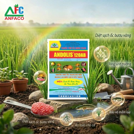 ANDOLIS 120AB là thuốc đặc trị ốc bươu vàng trên ruộng lúa vưới dạng bả mồi tiên tiến nhất. Ngoài hoạt chất diệt ốc thuốc còn có chứa chất dẫn dụ nên diệt ốc rất triệt để. Không đọc hại đối với cá, ít ảnh hưởng tới môi trường và con người. Thuốc ở dạng bả mồi nên ít ảnh hưởng khi trời mưa, thuốc rất dễ sử dụng có thể rải trước khi sạ, trộn giống hoặc rải sau khi sạ