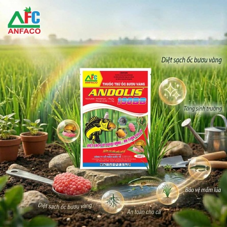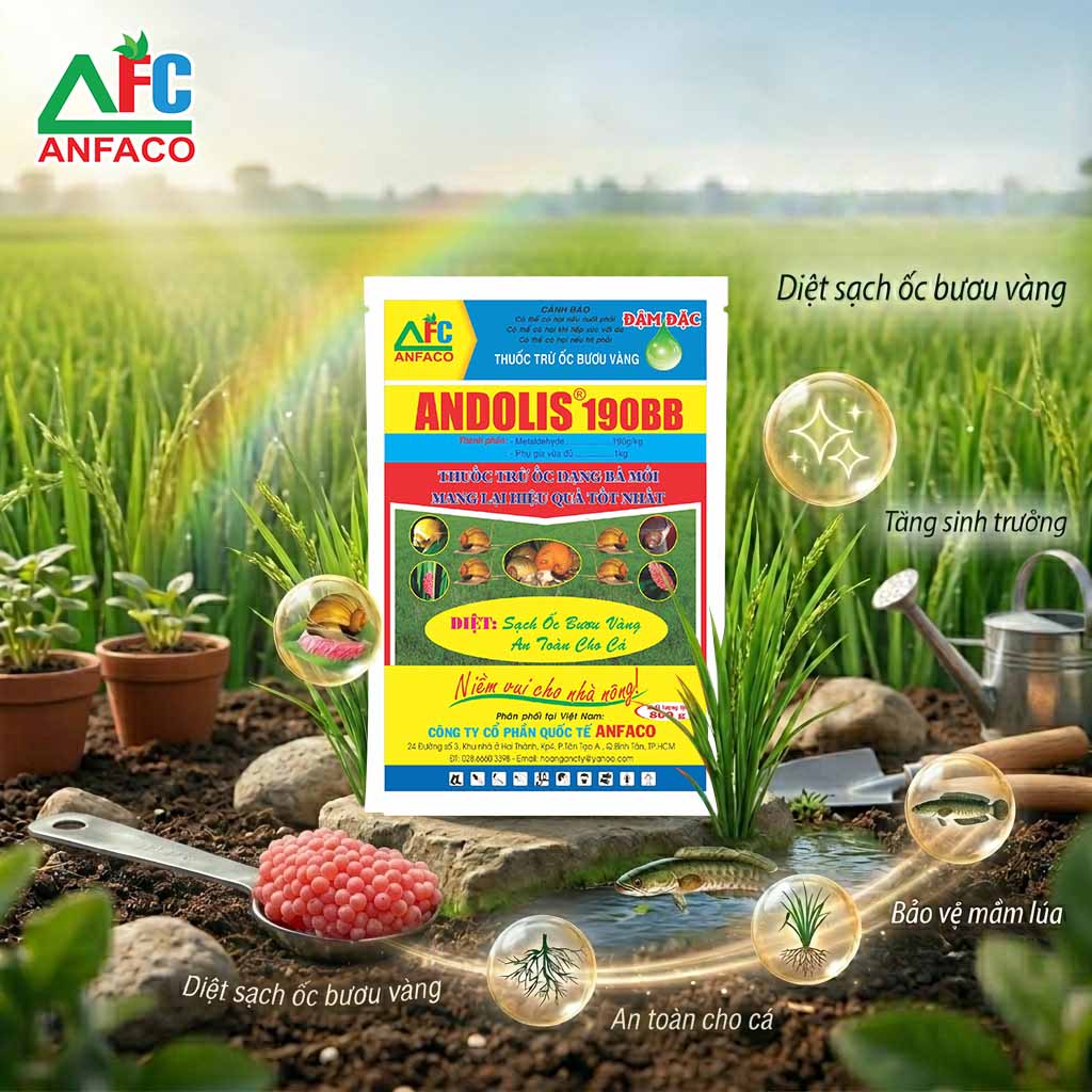 ANDOLIS 190BB là thuốc đặc trị ốc bươu vàng trên ruộng lúa vưới dạng bả mồi tiên tiến nhất. Ngoài hoạt chất diệt ốc thuốc còn có chứa chất dẫn dụ nên diệt ốc rất triệt để. Không đọc hại đối với cá, ít ảnh hưởng tới môi trường và con người. Thuốc ở dạng bả mồi nên ít ảnh hưởng khi trời mưa, thuốc rất dễ sử dụng có thể rải trước khi sạ, trộn giống hoặc rải sau khi sạ
